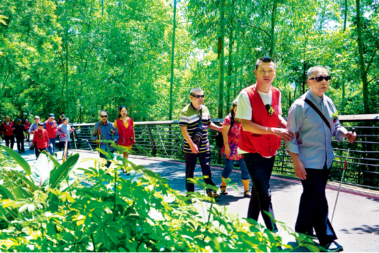 为了在全社会树立奉献、友爱、互助、进步的时代新风,在党中央的亲切关怀下,共青团发起青年志愿者行动,得到广大青年的积极响应,志愿服务成为新的社会风尚。图为2019年5月3日,福州青年志愿者引导视障者在郊野公园步行,感受鸟语花香。新华社记者 林善传/摄