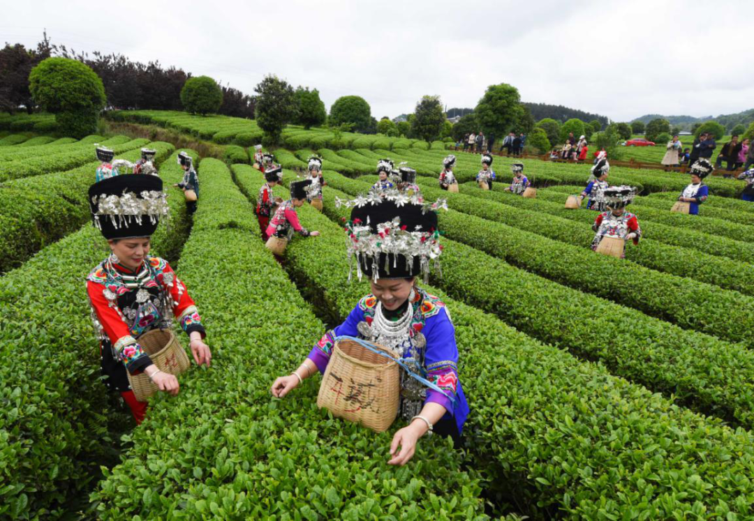 习近平总书记指出,发展产业是实现脱贫的根本之策。贵州重点发展12个农业特色优势产业,带动贫困群众增收脱贫,农民人均可支配收入突破万元大关。图为茶农在铜仁松桃苗族自治县普觉镇大同茶园采摘茶叶。