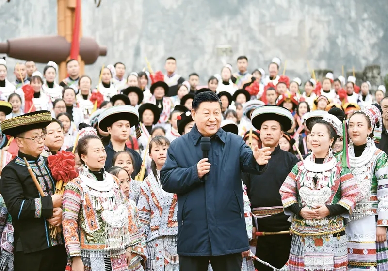 2021年2月3日至5日,中共中央总书记、国家主席、中央军委主席习近平来到贵州考察调研,看望慰问各族干部群众,向全国各族人民致以美好的新春祝福。这是3日下午,习近平在毕节市黔西县新仁苗族乡化屋村文化广场上,向全国各族人民、港澳台同胞和海外侨胞拜年。新华社记者 谢环驰/摄
