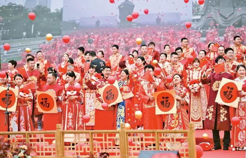 2021年6月27日,在“同心同庆 情满少海”山东省青岛市新时代文明实践集体婚礼胶州专场,137对新人齐聚一堂,以温馨浪漫而又简约简单的方式步入新时代文明实践婚姻的殿堂。图为新人们在集体婚礼上手持书法家送上的“福”字。人民图片 王昭脉/摄