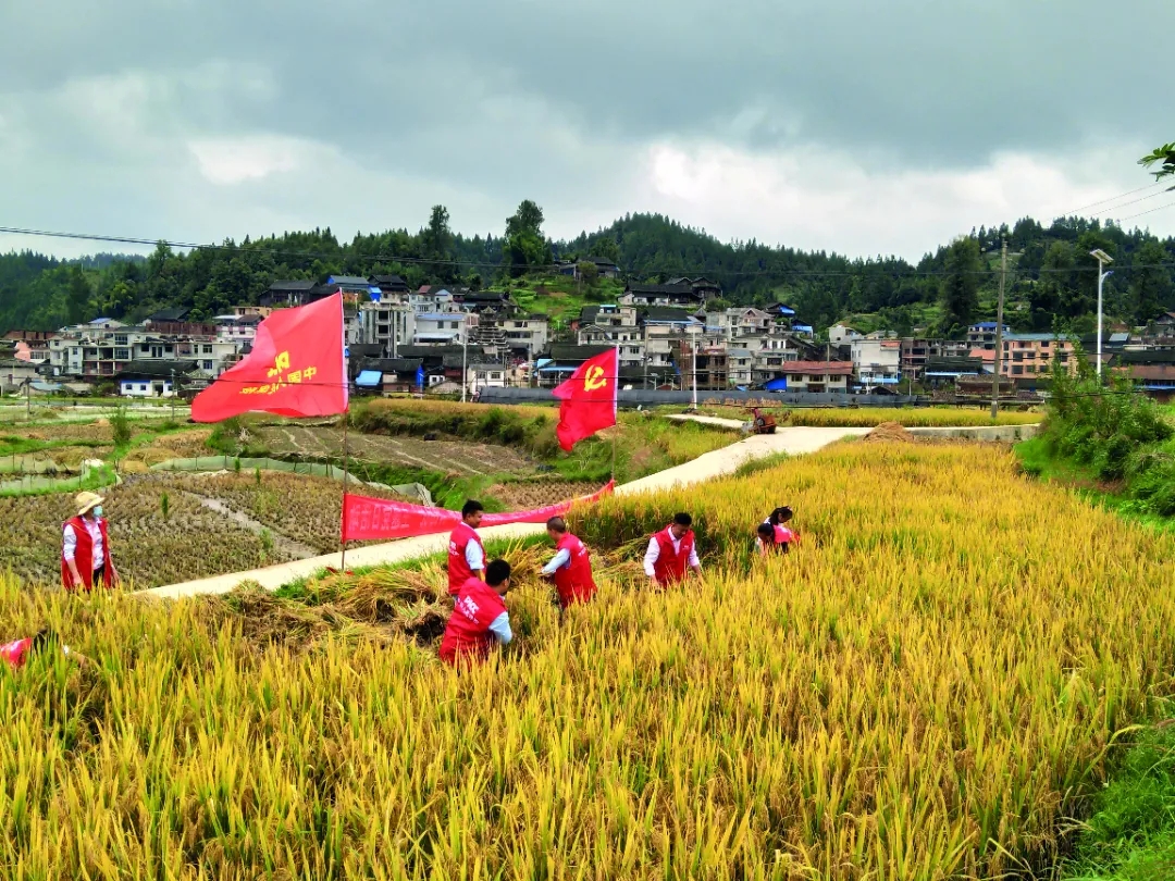 听闻贵州省黎平县岩洞镇未收割秋稻面临水泡、霉烂风险,中国人保黎平支公司全体党员奔赴稻田,帮助群众收割稻穗、打谷脱粒。 中国人民保险集团供图