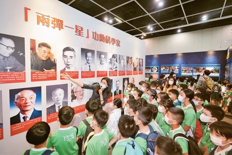 2021年6月27日至7月9日,“时代精神耀香江”之百年中国科学家主题展在香港向公众开放。图为7月7日,众多小学生仔细聆听讲解员的介绍。中新社记者 张炜/摄