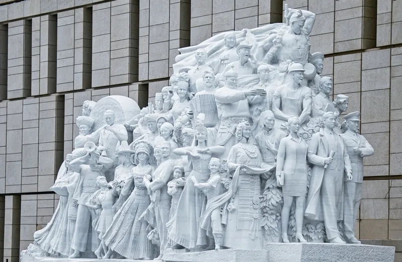 在雕塑《追梦》中,73位人物形象融入主体之中,形成团结一致、阔步前行的恢宏阵势,重点表现全国各族人民在中国共产党的团结带领下,为了实现民族复兴,在百年接续奋斗中走中国道路、弘扬中国精神、凝聚中国力量,坚毅前行的豪迈气概。刘新武/摄