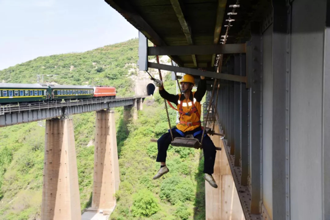 一根安全绳,挂在45米高的大桥上,检查、除锈、刷漆……这就是李玉斌的日常,大家亲切地称他为“秋千哥”。