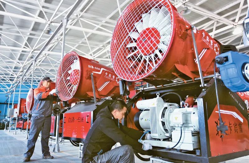 近年来,河北省张家口市宣化区抢抓2022年北京冬奥会和京津冀协同发展机遇,把发展冰雪装备制造业作为老工业基地转型升级的战略举措,助推经济高质量发展。图为2021年4月7日,位于河北省张家口市宣化区京张奥园区的一家滑雪装备制造企业,工人在造雪机装配生产线上工作。 求是图片 陈晓东/摄