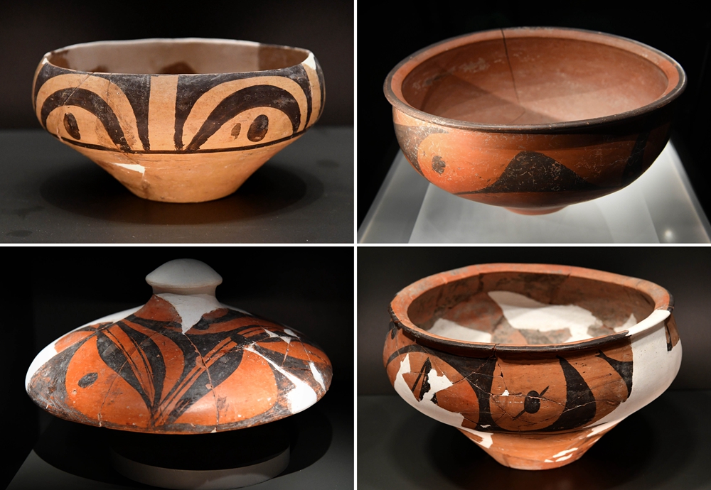 2021年10月18日,在第三届中国考古学大会开幕式上公布的“百年百大考古发现”终评结果中,河南三门峡庙底沟遗址入选。庙底沟仰韶文化博物馆是依托庙底沟遗址建立的专题博物馆,展出近4000件中原地区史前人类使用过的生产、生活用具等展品,其中70%以上是近年仰韶文化考古发掘的最新成果,彩陶文物展出数量大、类型全,生动展示了史前先民的生活图景。这是在庙底沟仰韶文化博物馆内拍摄的展品(拼版照片)。 新华社记者 李安/摄