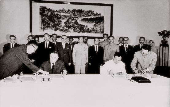 1964年4月22日,广东省政府代表刘兆伦与港英政府代表毛瑾(莫觐)在广州签订“东江水供港”协议。广东省水利厅供图