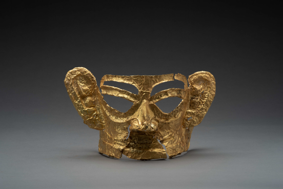2021年6月,当考古人员从三星堆遗址3号“祭祀坑”缓慢取出一块青铜罍残片后,一团被压得严重变形的金器出现在人们眼前。出土时,这件金器仿佛一张稿纸被揉成一团,难辨形状。经过修复,一张完整的金面具缓缓呈现。这张薄如蝶翼的金面具宽37.2厘米、高16.5厘米,重约100克,眉眼镂空,两耳轮廓圆润,鼻梁高挺,嘴形大而微张,造型威严神圣,是目前三星堆考古发掘中出土最完整的一件金面具。这一重大考古发现,再次震惊了世界。
