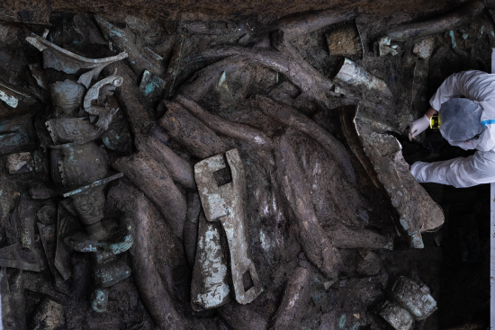 8号“祭祀坑”新发现一件顶尊蛇身铜人像,与1986年2号“祭祀坑”出土的青铜鸟脚人像残部拼对成功,专家将这件文物重新命名为鸟足曲身顶尊神像。神像凸目獠牙,戴有牛角面具,双手撑在一个带方座的青铜罍上,头上还顶着一个朱砂彩绘觚形尊。铜人像具有古蜀文明的特征,方座铜器是先周文化的代表,而尊是中原文化的代表。这三种文化因素集合到同一件器物上,生动地体现出古蜀文明是中华文明的重要组成部分。