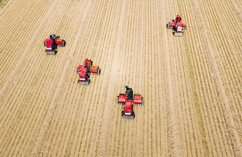 我国粮食安全保障能力持续提升,粮食生产实现“十九连丰”,总产量连续8年稳定在1.3万亿斤以上。图为2023年2月4日,在山东省聊城市东昌府区斗虎屯镇杨庙村,运兴农机专业合作社的员工驾驶着镇压机械为托管的冬小麦进行镇压控旺长保墒情作业。人民图片 张振祥/摄