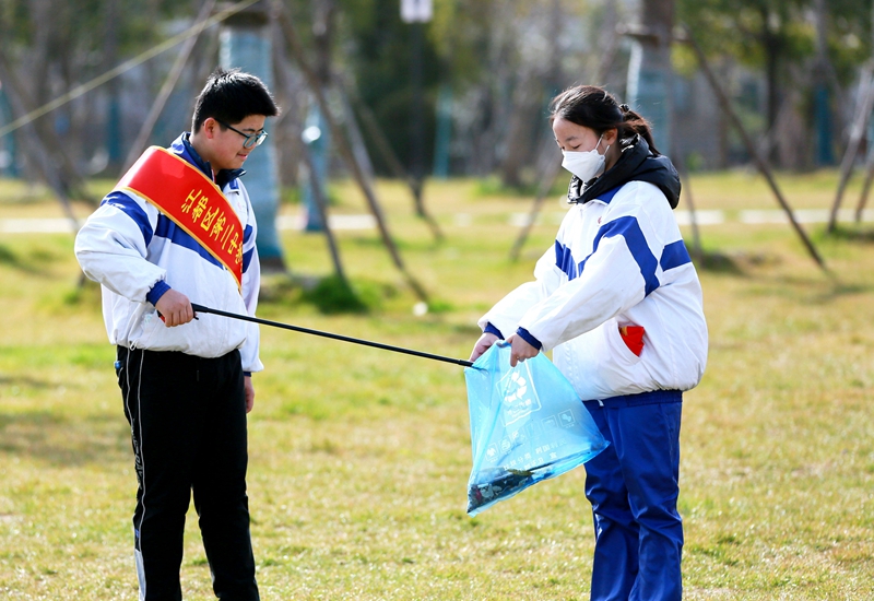 2022年3月5日,在江苏省扬州市江都区双拥公园,江都区第二中学学生在学雷锋主题活动中捡拾垃圾。新华社发 任飞/摄