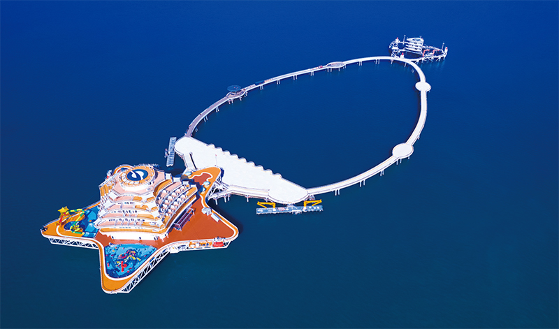位于山东烟台四十里湾海域的“耕海1号”海洋牧场综合体,集渔业养殖、海洋文旅、科普教育等功能于一体,实现了第一产业和第三产业的深度融合。图为2023年4月28日拍摄的“耕海1号”海洋牧场综合体。山东省委宣传部供图