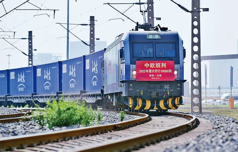 2022年8月21日,中欧班列(西安—汉堡)从西安国际港站开出。至此,中欧班列2022年累计开行10000列,较2021年提前10天破万列。新华社发 唐振江/摄