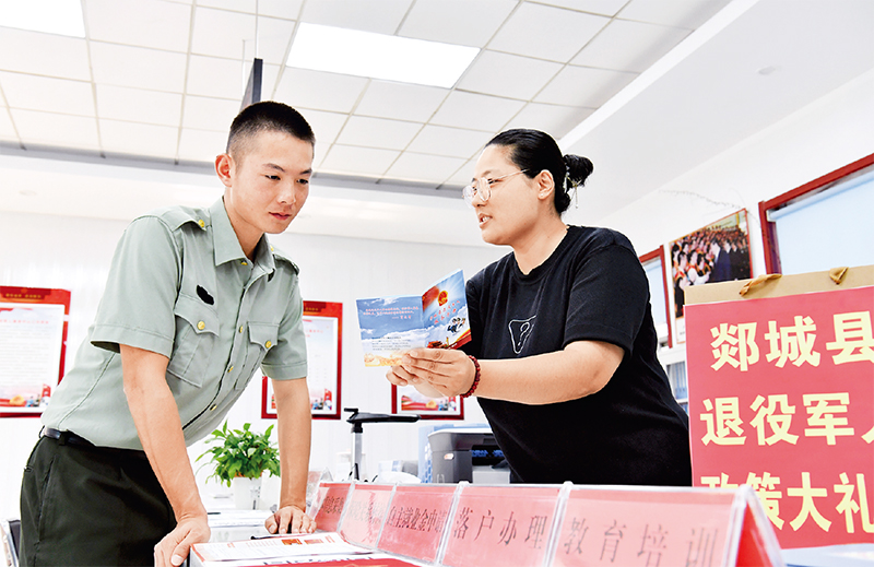 图为2023年9月1日,山东省临沂市郯城县退役军人事务局工作人员为退役军人赠送“政策大礼包”和介绍《退役军人服务手册》使用方法。中新社发 李结义/摄