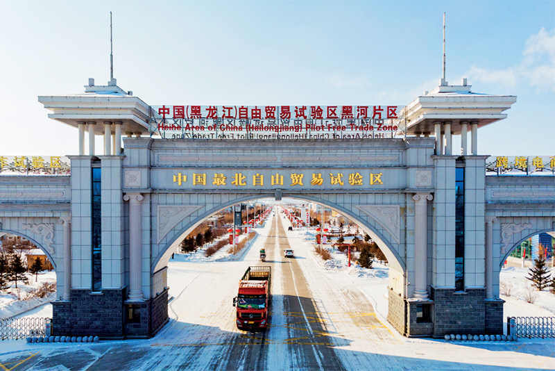 十年来,自贸试验区建设布局逐步完善,已先后7轮在全国范围内设立了22个自贸试验区,形成了覆盖东西南北中,统筹沿海、内陆、沿边的改革开放创新格局。图为2023年2月12日,运输车辆驶出中国(黑龙江)自由贸易试验区黑河片区大门。新华社记者 谢剑飞/摄