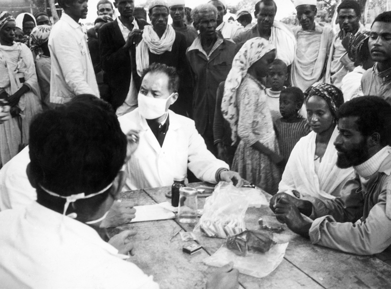 1974年,第1批援埃塞俄比亚中国(河南)医疗队队长梅庚年(中戴口罩者)为埃塞季马群众进行诊疗。国家卫生健康委供图