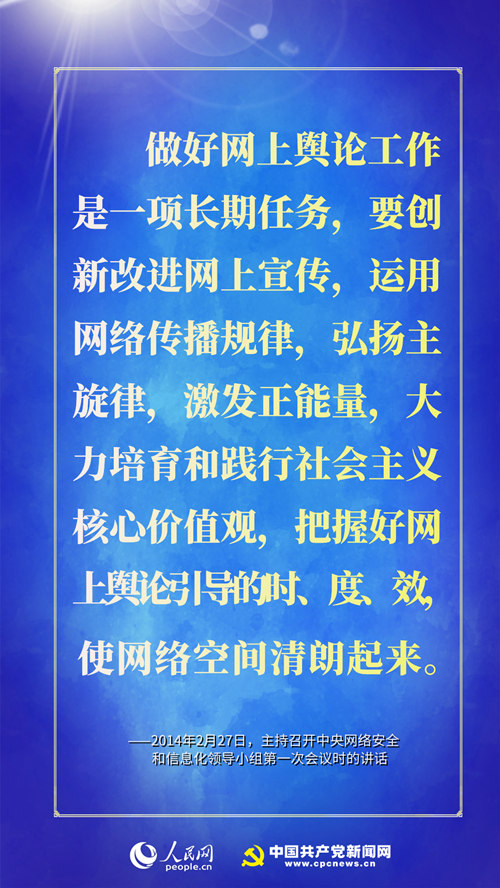 ★ 做好网上舆论工作是一项长期任务,要创新改进网上宣传,运用网络传播规律,弘扬主旋律,激发正能量,大力培育和践行社会主义核心价值观,把握好网上舆论引导的时、度、效,使网络空间清朗起来。