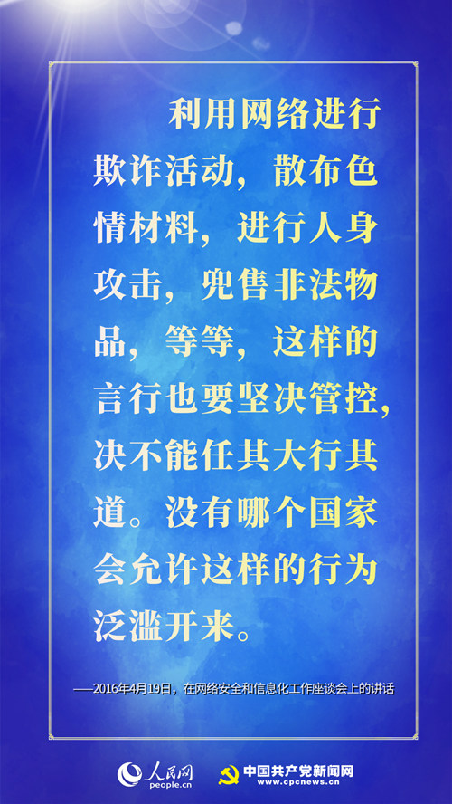 ★ 互联网不是法外之地。利用网络鼓吹推翻国家政权,煽动宗教极端主义,宣扬民族分裂思想,教唆暴力恐怖活动,等等,这样的行为要坚决制止和打击,决不能任其大行其道。利用网络进行欺诈活动,散布色情材料,进行人身攻击,兜售非法物品,等等,这样的言行也要坚决管控,决不能任其大行其道。没有哪个国家会允许这样的行为泛滥开来。