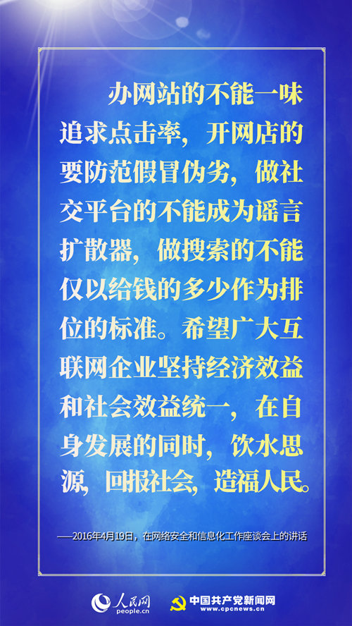 ★ “行生于己,名生于人。”我说过,只有富有爱心的财富才是真正有意义的财富,只有积极承担社会责任的企业才是最有竞争力和生命力的企业。办网站的不能一味追求点击率,开网店的要防范假冒伪劣,做社交平台的不能成为谣言扩散器,做搜索的不能仅以给钱的多少作为排位的标准。希望广大互联网企业坚持经济效益和社会效益统一,在自身发展的同时,饮水思源,回报社会,造福人民。