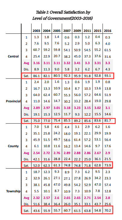 报告的结尾,研究者指出,到2016年,中国政府比过去20年中的任何时候都更受欢迎。平均而言,中国政府提供的医疗保健、社会福利及其他基本公共服务比2003年开始调查时要好得多,也更公平。此外,在腐败方面,2009年至2011年满意度下降的情况被完全逆转。公众似乎普遍支持反腐运动。在环境问题上,即使有许多居民表示不满,但大多数受访者预计未来几年情况会有所改善。