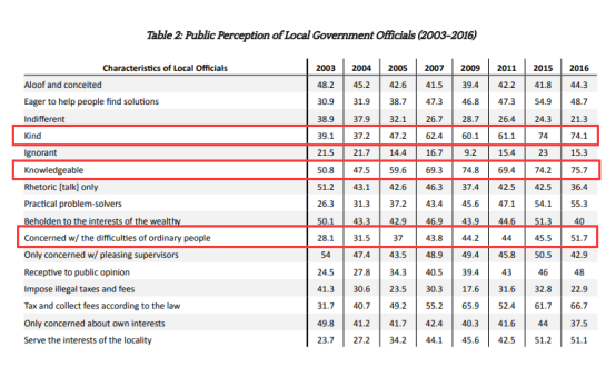 不仅如此,中国民众对地方政府官员的印象也发生了不少积极的转变。越来越多的民众认为,地方政府官员“友善、博学”“关心普通民众困难”。调查报告显示,在2003年间,仅39.1%受访民众表示地方政府官员“友善”,但这一数字在2016年升至74.3%。此外,也有75.7%的受访者认为地方政府官员“博学”。此外,更少的人认为他们“只说话不干事”“偏向于富人的利益”“只关心自己的利益”。