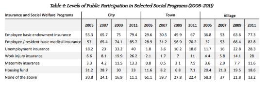 在公共服务方面,大多数受访者认为政府正在努力改善他们的物质福利,尤其值得肯定的是中国政府为弱势群体提供保障所作的努力。报告指出,在2006年至2011间,所有受访者中医疗保险覆盖面翻了一番,从43%增至95%。其中,中国农村居民参加基本医疗保险的比例从32%上升到82.8%,基本养老金覆盖面也从2005年的36.8%上升到2011年的71.3%。