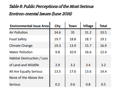 此外,在环境保护方面,2016年6月时,受访中国民众表示最担心的环境问题是“空气污染”,其次是“食品安全”和“气候变化”。但是,人们对环境问题的治理依然保持乐观,43%的人预计当地的空气质量会变得更好。