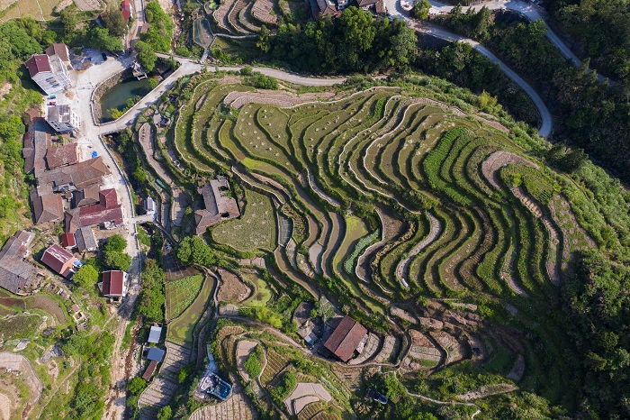 近年来,浙江省青田县西坑村依托环境和生态优势发展特色种植养殖产业,通过土地流转并结合原有种植水稻、旱粮等作物的传统,推行“贝母+稻鱼共生”轮作种养的山乡特色农业产业发展,全面提高粮食产量、提升农业效益。图为西坑村俯瞰图。新华社记者 徐昱 摄
