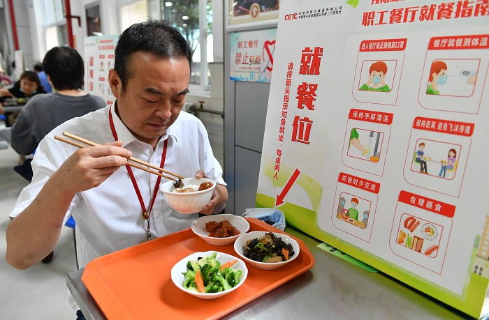 连日来,全国各机关单位、餐饮企业通过加强宣传、推出半份菜和小份菜等措施,积极营造厉行节约、反对浪费的餐饮风尚。图为8月19日,中国电子科技集团公司第二十研究所一名员工选择半份菜用餐。新华社记者 张博文 摄