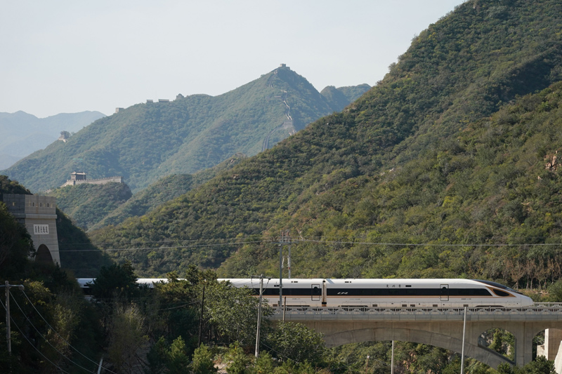 一列复兴号高铁列车从京张高铁驶过居庸关长城(10月6日摄)。新华社记者 鞠焕宗 摄