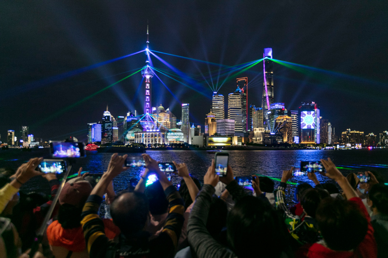 人们在上海外滩观赏灯光秀(10月5日摄)。新华社记者 王翔 摄