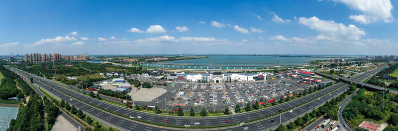这是沪宁高速公路苏州段阳澄湖服务区(10月8日摄,无人机全景拼接照片)。阳澄湖服务区于2019年5月完成升级改造,通过大型水景等元素还原“诗画江南”意境,成为当地的“新景点”。新华社记者 李博 摄