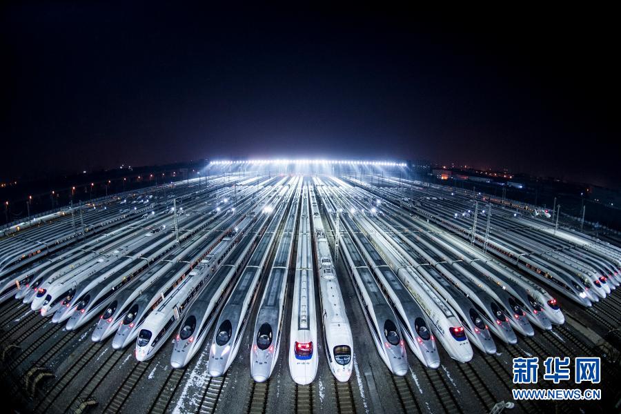 动车组停靠在武汉动车段的存车线上,准备进行检修和保温作业(2018年2月1日摄)。新华社记者 肖艺九 摄