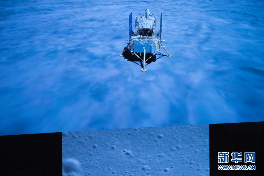 2020年12月1日23时11分,嫦娥五号探测器成功着陆在月球正面西经51.8度、北纬43.1度附近的预选着陆区,并传回着陆影像图。这是在北京航天飞行控制中心拍摄的嫦娥五号探测器落月瞬间。新华社记者 金立旺 摄