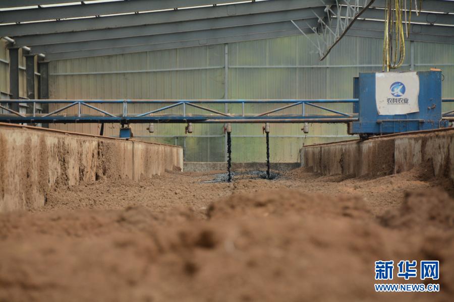 在福建省福清市永诚华多种猪公司猪场内,半自动化机械将收集的养殖粪污喷洒至垫料上。这是福建首创的“异位发酵床”技术,发酵后的粪污可以作为有机肥源,并可以让养殖场实现污染“零排放”(2019年8月12日摄)。新华社记者 林超 摄