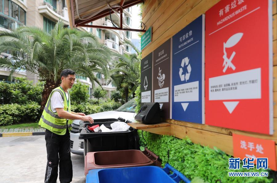 在上海市虹口区嘉兴路街道一处小区,保洁工对居民分类投放的生活垃圾进行分拣(2019年6月24日摄)。新华社记者 方喆 摄