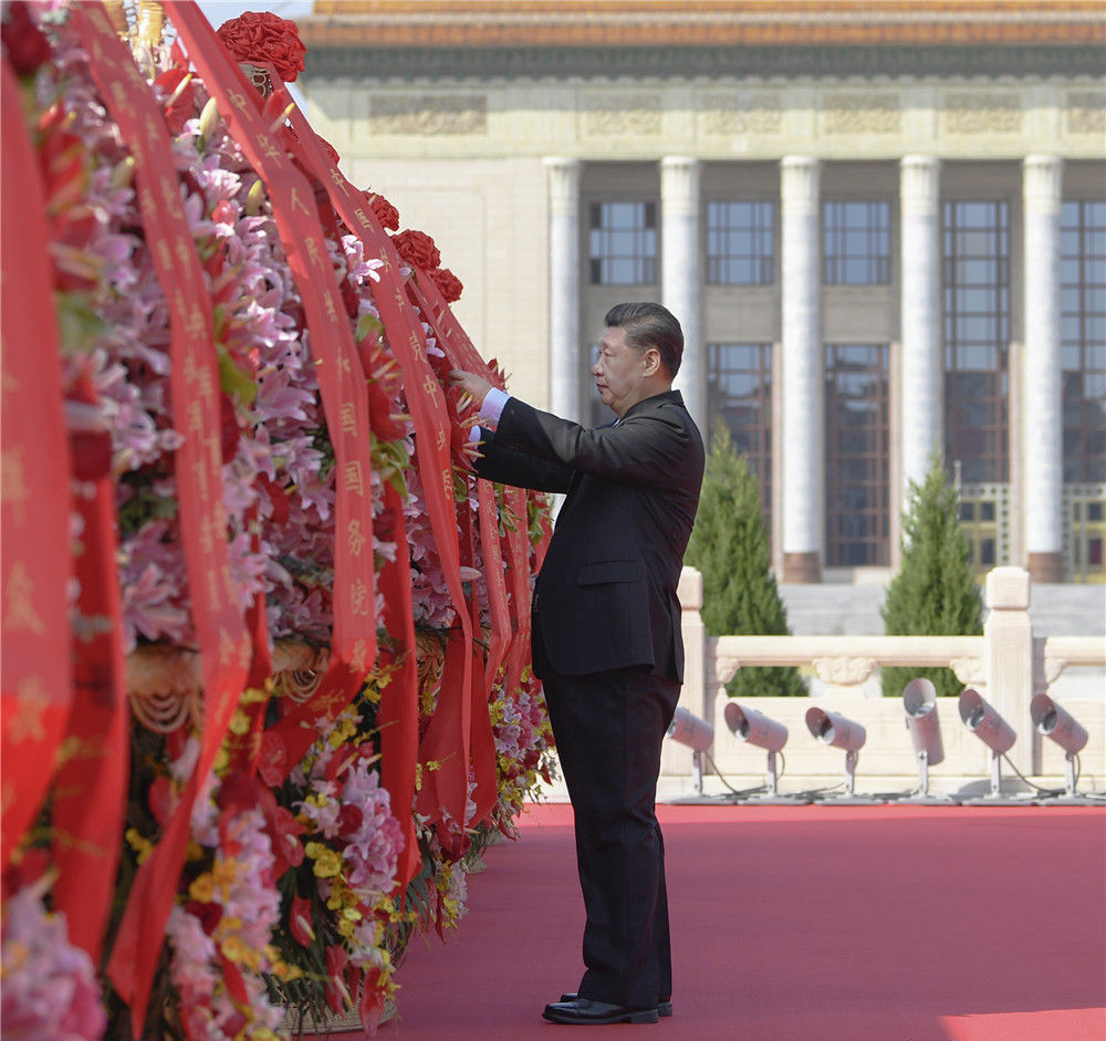 2020年9月30日,习近平出席烈士纪念日向人民英雄敬献花篮仪式。这是习近平整理花篮上的缎带。