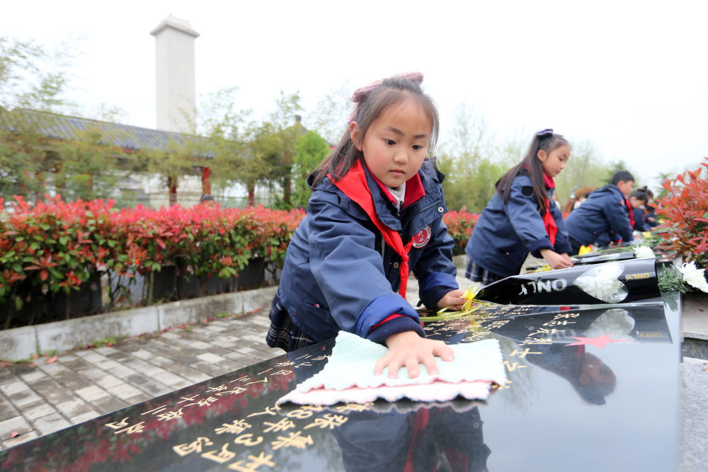 2021年4月1日,在安徽省淮北市相山区烈士陵园,淮北市泉山路学校学生擦拭烈士墓。