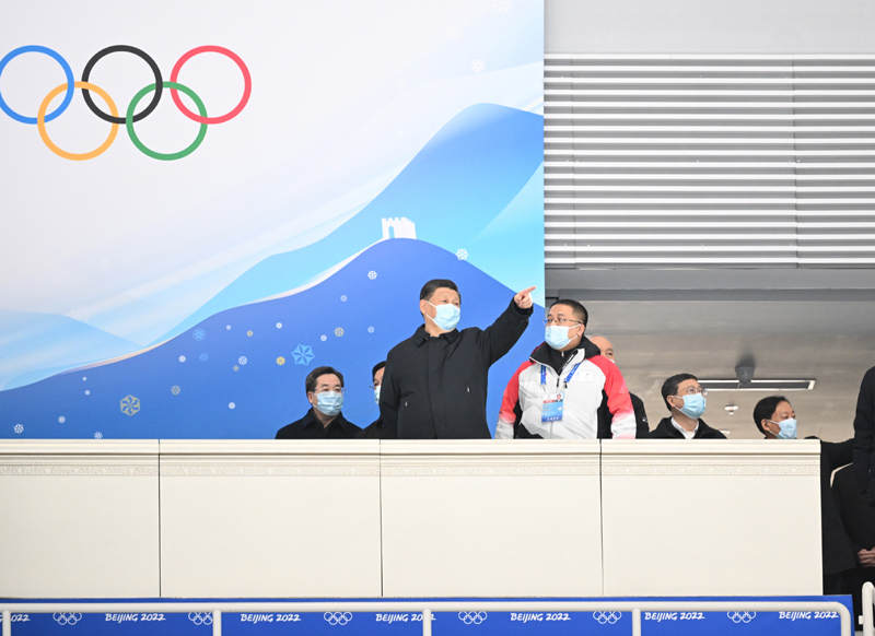 2022年1月4日,习近平总书记在北京考察2022年冬奥会、冬残奥会筹办备赛工作。这是4日上午,习近平在国家速滑馆主席台区察看场馆内部布置及赛道情况。新华社记者 申宏 摄