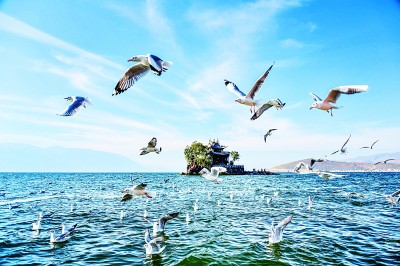 随着洱海生态向好,每年11月到第二年3月,来自西伯利亚的红嘴鸥成群结队到洱海过冬。杨继培摄/光明图片