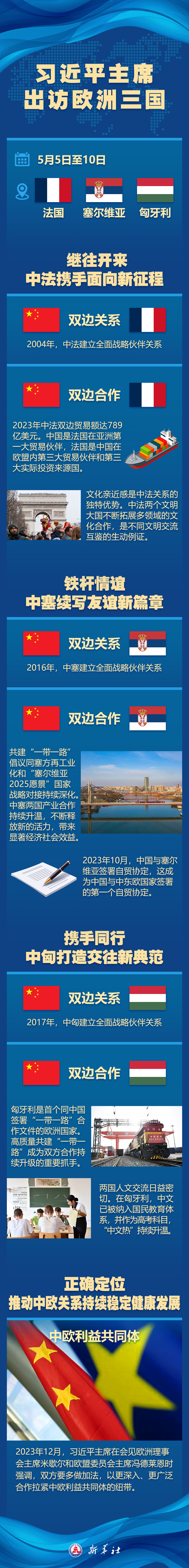 应法兰西共和国总统马克龙、塞尔维亚共和国总统武契奇、匈牙利总统舒尤克和总理欧尔班邀请,国家主席习近平将于5月5日至10日对上述三国进行国事访问。访问期间,习近平主席将同法国、塞尔维亚、匈牙利领导人为双边关系、中欧关系健康发展指引方向,为拓展深化互利合作注入动力。一起来看↓↓↓