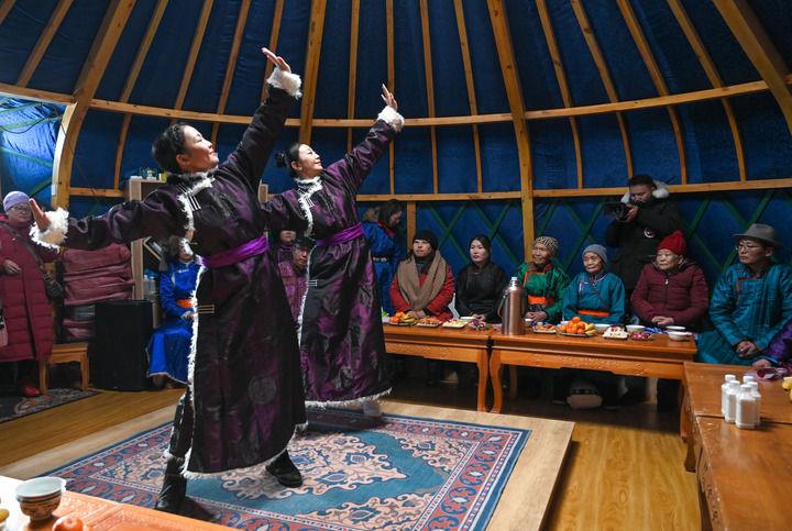 2023年12月21日,乌兰牧骑队员在内蒙古阿其图乌拉苏木进行舞蹈表演。