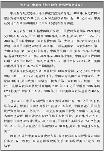 中美经贸关系是两国关系的“压舱石”和“推进器”,事关两国人民根本利益,事关世界繁荣与稳定。两国建交以来,双边经贸关系持续发展,合作领域不断拓宽,合作水平不断提高,形成了高度互补、利益交融的互利共赢关系,不仅两国受益,而且惠及全球。
