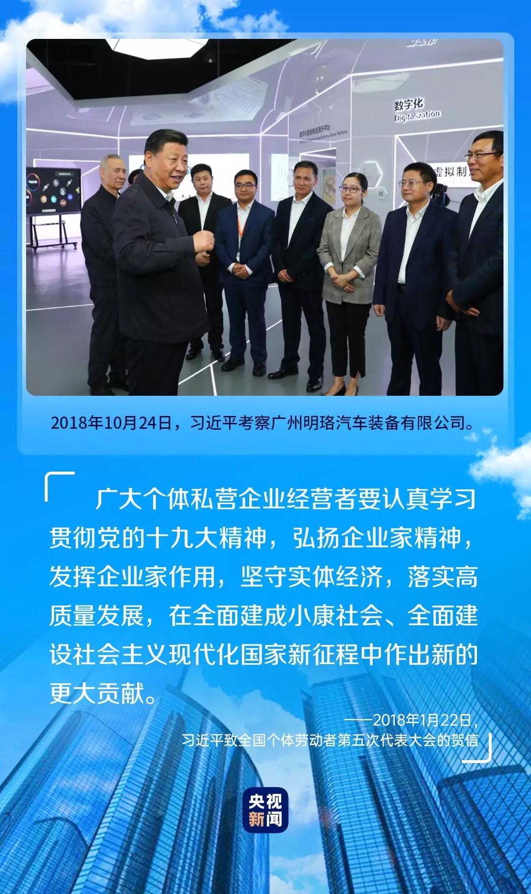 2018年10月24日,习近平在广东考察时来到广州明珞汽车装备有限公司,同在场的中小民营企业负责人亲切交谈,肯定他们在自主创新方面取得的成就。他表示,党中央高度重视并一直在想办法促进中小企业发展。只有这样才能够真正使我国经济全面发展、科学发展、高质量发展。我们大力提倡创新创造创业,既离不开中小企业,也给中小企业发展提供了更多机会和更大空间。习近平希望广大中小企业聚焦主业,加强自主创新,通过自身努力不断取得新的业绩,让企业兴旺发达,为我们祖国强大和人民幸福作出更大贡献。