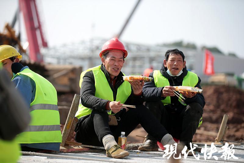 即便是在吃饭时,工人们也不会离开工地,大家就在自己的岗位上捧起盒饭,大口大口吃起来。午歇时,大部分工人都主动加班工作,有人实在累极了,就地坐下小憩片刻,身下就是潮湿的泥土,他们也毫不在意。