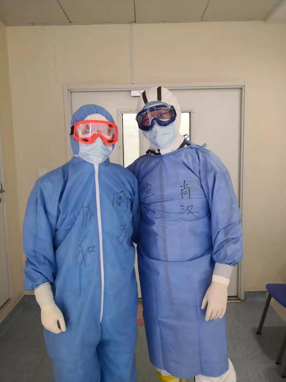 2月8日,首都医科大学宣武医院呼吸内科副主任肖汉(右)在武汉协和医院与同事在一起。