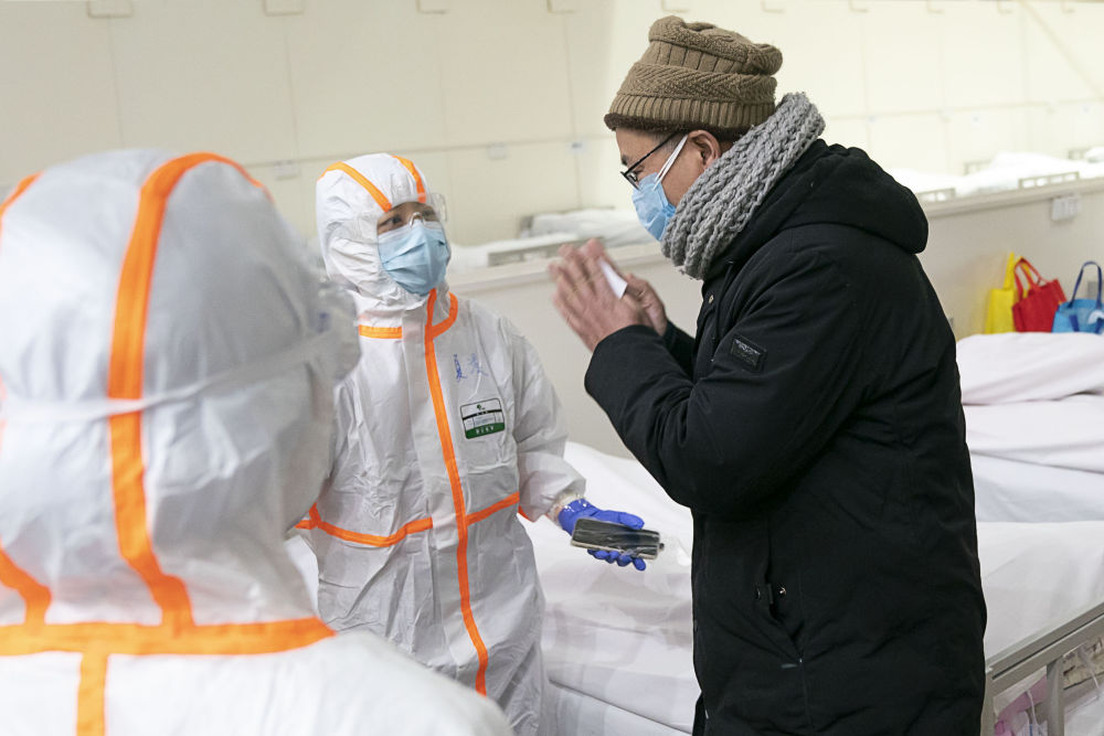 2月5日,一名患者在武汉江汉方舱医院对医护人员表示感谢。新华社记者 熊琦 摄