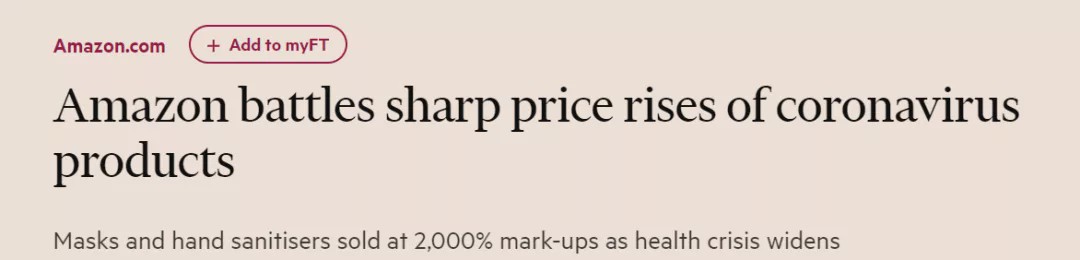 The risks to health care and public health from tariffs outweigh any benefit to trade or economics,” he said.实际上,美国如此迅速地就批准豁免了一批医疗用品的进口关税,与国内市场的压力不无关系。在亚马逊网站上,有美国商家就把口罩价格炒出20倍!随着美国新冠肺炎病例数量不断上升,电商平台上,口罩及其他防护用品的价格一路飙升。《金融时报》3月3日报道称,在亚马逊网站上,有些商家甚至将免洗洗手液和口罩的价格提升至日常零售价的2000%。Hand sanitiser and respiratory masks were in some cases being sold on the site on Monday at a more than 2,000 percent mark-up, compared to normal retail prices……