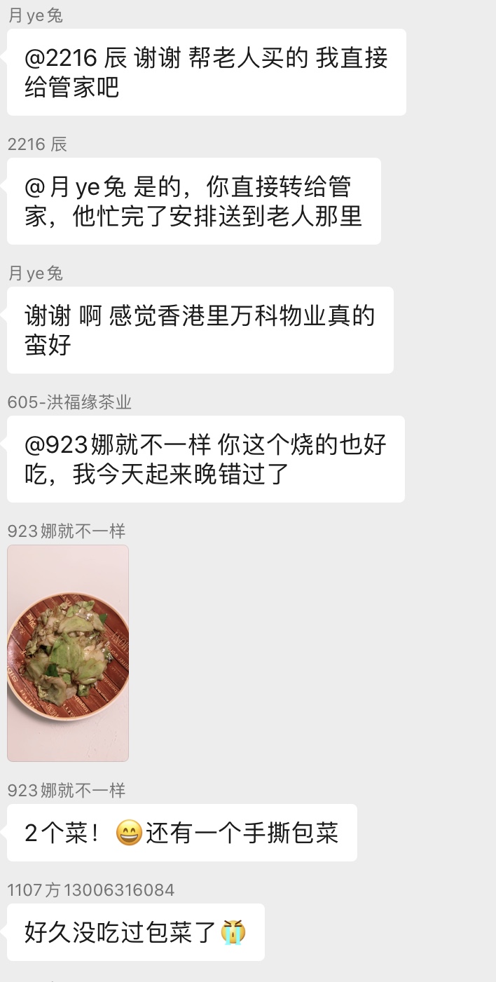 有的住户在群里发了“花式”做油麦菜的图片后,其他好几家住户纷纷讨教做法,几个人就在群里就蔬菜“怎么炒不会老、如何保持口感和鲜度”等等问题展开热烈讨论。还有一位住户赞扬道:“厉害啊,你这个菜看似简单,但特别精致。”