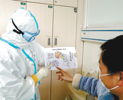 为缓解患者的焦虑情绪,在武汉大学中南医院隔离病房,河北医疗队护士用漫画同患者交流。高 翔摄(新华社发)